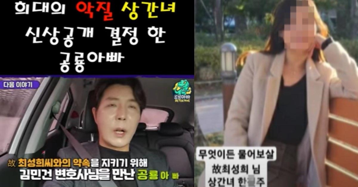 유튜브 채널 '불륜 잡는 헌터 공룡아빠'가 지난 10월 15일 췌장암으로 사망으로 최성희 씨의 상간녀의 신상을 공개해 많은 논란과 화제가 되고 있습니다.